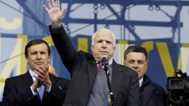 Киевдаги Мустақиллик хиёбонида икки АҚШ сенатори - Крис Мёрфи ва Жон Маккейн намойишчилар олдида чиқиш қилганлар.