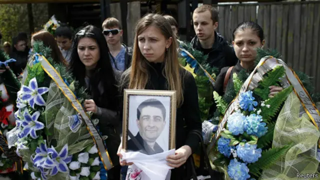 Хорливкада бўлган Би-би-си мухбири Стив Розенберг келажак учун ишончсизлик ва чуқур тушкунлик манзарасида ўтган маросимда жаноб Рыбакнинг яқинлари ва дўстлари руҳонийнинг сўзларини тингладилар.
