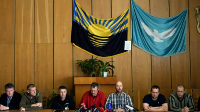 Украина шарқида россияпараст фаоллар томонидан қўлга олинган Оврўпо Хавфсизлик ва Ҳамкорлик ташкилоти кузатувчилари журналистлар қаршисига чиқишган.