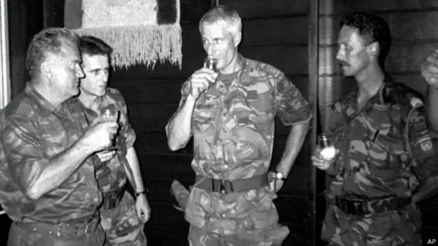 Босния серблари армияси қўмондони Ратко Младич ва Ҳолландия кучлари полковниги Тон Карреманс.