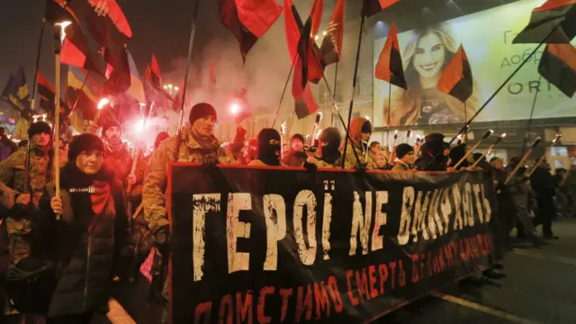 Украин миллатчилари Иккинчи Жаҳон Уруши пайтида Советларга қарши курашган Степан Бандера шарафига Киев бўйлаб юриш қилдилар.