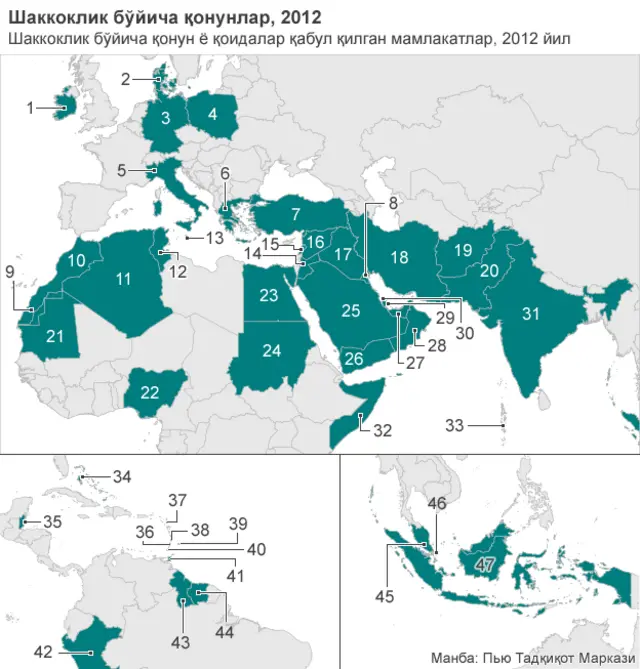 Пью Тадқиқот Маркази шаккоклик борасида қонун-қоидалар қабул қилинган мамлакатлар харитасини тузиб чиқди.