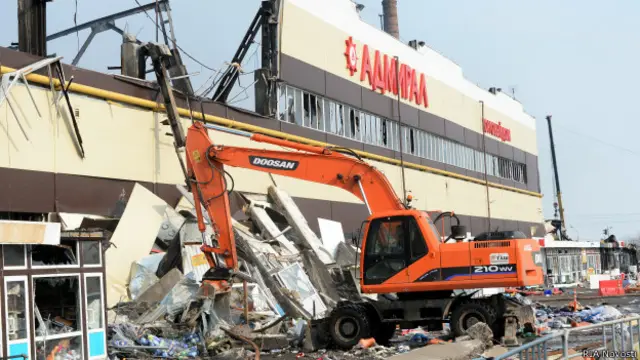 Олов ичида қолган савдо марказига кириш йўллари полиция томонидан тўсиб турилганига қарамасдан, бизнес эгалари ичкаридан ўз буюмларини олиб чиқиш учун ичкарига чопиб кирганлар.
