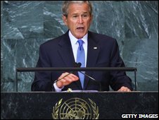 Ông nói ông đã có "những bước đi quan trọng" và nói việc đàm phán với Quốc hội về kế hoạch cứu giúp Phố Wall đã được thực hiện trong thời gian cấp bách. Tuy nhiên, điều mà ông Bush muốn nhấn mạnh vẫn là các chủ đề ưa thích, mà có lẽ ông vẫn hy vọng sẽ được coi là di sản ông để lại - cuộc chiến vì tự do, chống khủng bố. Kêu gọi hành động Tuy nhiên, tại khu vực hành lang của Liên Hợp Quốc ngày hôm nay, ông Bush có vẻ như đang bị mất liên hệ. Điều gây lo lắng trong tuần này không phải là vấn đề khủng bố, mà là những ảnh hưởng của cuộc rối loạn tài chính phát sinh từ nước Mỹ và gây tác hại tới nhiều quốc gia bên ngoài. Chẳng có một chính sách quốc gia nào của Mỹ, dẫu cho được ban hành bởi tổng thống hay bởi Cục Dự Trữ Liên Bang, được cho là đáp ứng được tình hình vào lúc này. Nhiều người có vẻ cho rằng cần có hành động chung, dựa trên những tác động tới cả các nước nghèo lẫn nước giàu. Ảnh hưởng của Mỹ có vẻ như đang tàn lụi đi, và hiện đang có những lời kêu gọi tìm kiếm một lực lượng lãnh đạo thế giới mới thay chỗ. Tổng thư ký Liên hợp quốc Ban Ki-moon tuyên bố: "Cuộc khủng hoảng tài chính toàn cầu đang đe doạ tới toàn bộ chúng ta. Nếu như cần có lời kêu gọi phải hành động chung, lời kêu gọi cần có lãnh tụ thế giới, thì đây chính là thời điểm thích hợp." Tổng thống Iran Mahmoud Ahmadinejad thì gọi Mỹ là một "quốc gia chuyên đi bắt nạt" và nói Hoa Kỳ đang rơi vào thời kỳ lụi tàn. Ông nói "đế chế Mỹ" đã đi đến cùng đường và các nhà lãnh đạo tương lai của nước này sẽ phải hạn chế việc can thiệp của mình ở bên trong lãnh thổ mà thôi. Luật chơi mới? Tổng thống Brazil lên án những đối tượng mà ông gọi là "những kẻ tung tinh đồn vô chính phủ" mà "lợi nhuận luôn được tư hữu hoá trong lúc các khoản thua lỗ luôn được xã hội hoá"