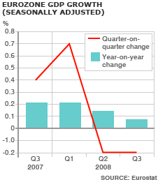 Trong khi đó Bộ trưởng Tài chính Pháp Christine Lagarde cho biết Pháp vẫn đạt mức tăng trưởng 0.14% trong quý ba. Tuy nhiên các chuyên gia dự báo tình trạng tồi tệ nhất về kinh tế còn đang ở phía trước đối với các nước dùng đồng euro. Với mức lạm phát đang giảm đi, nhiều chuyên gia cho rằng Ngân hàng Trung ương Âu châu sẽ tiếp tục hạ lãi suất với khả năng xuống tới mức 2%, tương đương với mức áp dụng hồi mới thành lập khu vực sử dụng đồng euro. Các nước sử dụng đồng euro là Pháp, Italy, Đức, Bỉ, Bắc Ireland, Hà Lan, Luxembourg, Tây Ban Nha, Bồ Đào Nha, Slovenia, Malta, Greece, Austria, Phần Lan và Cyprus. | ||||||||||||||||||||||||||||||||||||||||||||||||||||||||||||||||||||||||||||||||