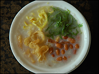 Cải biến Các món điểm tâm ở Quảng Đông ngày nay rất phong phú, một phần vì xã hội đã thay đổi nhiều, các món ăn và khẩu vị cũng đổi khác theo. Vừa biểu diễn làm món canh dưa hấu mùa đông gồm có 8 vị khác nhau rất công phu, đầu bếp chính Ngô Tử Quý vừa giải thích với tôi, "Chúng tôi phải thích nghi bằng cách đưa những yếu tố mới lạ vào các món ăn của nhà hàng." Nhưng dù có được cải biến khác lạ bao nhiêu, các món điểm tâm Quảng Đông đều xuất phát từ nguồn gốc dân dã. Ông Khuất Tiểu Bái, làm tiếp thị tại khách sạn Victory, một khách sạn 4 sao ở Quảng Châu, (nơi ngày xưa Phạm Hồng Thái ám sát hụt một toàn quyền của Pháp), đơn cử món cháo Trạng nguyên. "Ngày xưa có một người học trò lên trường thi, lúc về nhà đói bụng nhưng vô bếp thấy không còn gì để ăn, chỉ còn tí cháo trắng và một ít đồ ăn thừa, kể cả vài hạt động phộng rang. Thế là anh ta bèn trút hết mọi thứ vào trong bát cháo để ăn cho đỡ đói." "Đến ngày có kết quả thi, anh ta đỗ Trạng nguyên, dân chúng đồn với nhau rằng nhờ ăn loại cháo hỗ lốn đó mà anh ta thi đỗ cao cho nên kể từ đó họ gọi đó là cháo Trạng nguyên, một món điểm tâm rất phổ thông còn tồn tại cho đến ngày nay." Một điểm độc đáo của dim sum là có thể ăn nhiều món mà không thấy no, lai rai ăn hoài không ngán nhờ có trà. Nếu chưa thử qua, quý vị hãy ăn điểm tâm bằng dim sum, tôi tin rằng quý vị sẽ không thất vọng đâu. | CÁC BÀI LIÊN QUAN Hoa Kiều trở về Khai Bình22 Tháng 12, 2006 | Á Châu Trung Quốc xuất khẩu nghệ thuật21 Tháng 12, 2006 | Á Châu Một Trung Quốc 'trẻ trung'19 Tháng 12, 2006 | Á Châu Nông dân trước tăng trưởng kinh tế18 Tháng 12, 2006 | Á Châu | ||||||||||||||||||||||||||||||||||||||||||||||||||||||||||||||||||||||||||||