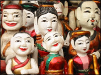Tôi lấy một ví dụ để quí vị dễ thấy. Chúng tôi đến Nhà hát Múa rối Nước và muốn mua 3 vé xem buổi diễn 8 giờ 30 tối. Cô bán vé đốp chát trả lời "No" (Không) và tự động xé 3 vé đưa chúng tôi. Chúng tôi hỏi lại rất lịch sự là “Không” có nghĩa là thế nào thưa cô? Tức là không có buổi lúc 8:30 hay là không có loại vé 20 ngàn đồng (vì có 2 loại hạng ghế là 20 và 40 ngàn VND). Cô ấy lẩm bẩm lại câu “Không” và rồi thì chúng tôi nhìn vào vé cô đưa cho chúng tôi thì mới biết là cô đưa cho chúng tôi vé 40 ngàn đồng và buổi xem là 9:15. Chúng tôi bảo cô ấy là chúng tôi muốn mua vé cho loại ghế rẻ tiền hơn và rồi cô lại tiếp tục càu nhàu. À, mà quí vị có biết là khi chúng tôi nói thì cứ như là cho chúng tôi nghe mà thôi vì cô này đọc báo đặt trên bàn và thậm chí không ngẩng đầu lên nói chuyện với chúng tôi.  | | | Múa rối nước là mục "đắt khách" |