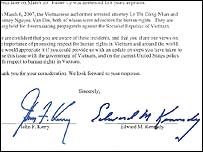 Hai nhân vật đầy ảnh hưởng trong chính trị Hoa Kỳ vốn theo xu hướng thân thiện với Hà Nội cũng đề nghị Bộ trưởng Ngoại giao hãy đề cập đến vấn đề nhân quyền “nghiêm trọng” ở Việt Nam. Hai thượng nghị sỹ Edward Kennedy và John Kerry trong thư ngày 9.04 đã bày tỏ lo ngại của họ trước các vụ án xử linh mục Nguyễn Văn Lý, luật sư Nguyễn Văn Đài và Lê Thị Công Nhân. Họ đề nghị tiến sĩ Rice cập nhật cho họ “những biện pháp bà đưa ra để nêu đề tài nhân quyền với chính quyền Hà Nội và chính sách của Hoa Kỳ về tình trạng nhân quyền ở Việt Nam’. Khi đến Hà Nội hồi tháng 11.2006 để dự Hội nghị Thượng đỉnh APEC, Ngoại trưởng Hoa Kỳ Condoleezza Rice đã khen ngợi nước chủ nhà về công cuộc cải cách. Bà nhắc nhở Bắc Hàn cùng Miến Điện hãy noi theo ví dụ Việt Nam để “gia nhập cộng đồng thế giới với một con đường mới của hoà bình và cơ hội " (a new path of peace and opportunity). Nhưng các vụ xử những người bất đồng chính kiến diễn ra dồn dập sau khi không khí hồ hởi của APEC đã lắng xuống và Việt Nam đã thành thành viên Tổ chức Thương mại Thế giới đã khiến dư luận Phương Tây nghĩ lại về Việt Nam. Truyền thông quốc tế Cuộc gặp của TT George Bush và bộ tham mưu chính trị, an ninh và ngoại giao của ông hôm 29.05 với bốn nhân vật vận động đối lập Việt Nam ở Mỹ đã được báo chí toàn cầu loan tải rộng rãi. Các báo Mỹ cũng đăng tin về vụ dân biểu Dân chủ từ Oregon, ông Earl Blumenauer từ chức Nhóm nghị sĩ thân Việt Nam (US-Vietnam Caucus) tại Hạ viện để phản đối “cách đối xử của nhà cầm quyền ở Hà Nội đối với những tiếng nói đối kháng ôn hòa”. Cho đến 30.05 gần như tất cả các báo lớn của Hoa Kỳ như International Herald Tribune, Boston Globe, trang ABC News đến các báo nhỏ ở Philadelphia, Oregon, Wyoming đều có bài nói ‘TT Bush lo ngại về nhân quyền ở Việt Nam’ hoặc về vụ từ chức của ông Blumenauer. Điểm báo quốc tế thì có hàng chục báo trên toàn cầu đã chạy tin về đề tài ‘Nhân quyền ở Việt Nam’, từ tờ The Guardian thiên tả ở Anh đến các báo ở Áo và Nam Phi. Cách nhìn nhận chung là Việt Nam đã tạo ra hy vọng trên trường quốc tế về một “con đường mới” nhưng nay thì lại “thắt chặt gọng kìm” về chính trị. Đặc biệt, các vụ xử án, nhất là vụ xử linh mục Công giáo Nguyễn Văn Lý với bức hình 'bịt miệng' nổi tiếng đã khiến Hà Nội thêm thù mất bạn. Bạn bè nay còn đâu