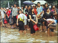 Từ lúc này, sinh hoạt được rút lên tầng trên, trừ lúc nấu cơm thì đành chấp nhận bì bõm trong nước. Nhà hàng xóm đã nhanh nhạy lôi tấm giát giường buộc với những cục xốp và đệm cao su làm thành bè. Ngoài ngõ đã ngập sâu đến 1m. Những người phụ nữ nhẫn nại đội nón, dầm mình trong nước đi ra đường kiếm cái ăn. Vốn đã quen với việc giá cả leo thang không kịp trở tay trong một năm nay do lạm phát, các bà các chị lo xa không quản nước bẩn với mưa rét mà trang bị cho cả nhà. Hãy theo chân chị tôi để hình dung ra sự “tấm mẳn” của người đàn bà Việt thành thị thời nay. Chị tôi nghe phong phanh hàng xóm nói ngoài ngõ ngập quá thắt lưng thì tóm ngay lấy một chiếc quần sơ-cua, nhưng đã xác định tinh thần là ngâm mình rồi tí về thay rửa sau. Những người phụ nữ thành phố vốn quen sạch sẽ nay cười ngượng nghịu với nhau vén quần quá đùi, lễ mễ xách túi mua đồ ăn với đồ thắp sáng cho những ngày mù mịt tới. Chợ ngày lũ họp theo đúng kiểu “thần tốc, táo bạo”. Những người bán hàng rong (chẳng cứ lúc này mới thấy hàng rong là cần) kiếm những chỗ còn đủ cao để bày thực phẩm trên những cái mẹt hoặc xách tay mà bán như chợ trời Đông Âu. Bán hàng như những ngày này mới sướng: rau muống 20.000 đồng, rồi 25.000 đồng một mớ, thịt lợn nạc vai bình thường 60.000 đồng một kg, nay vọt lên 160.000 đồng. Bà chị tôi ngần ngừ đi qua một người bán hàng xách hai con gà làm sẵn có giá 200.000 đồng/con. Đi được mấy bước, chị nghĩ bụng, trời này thì không biết đâu mà lường. Hối hả quay lại thì thấy người bán chỉ còn duy nhất một con. Chị tôi gần như giật lấy con gà và trả tiền ngay, không cần mặc cả. Trong các siêu thị và cửa hàng, gạo và mì ăn liền bán chạy như tôm tươi. Người Hà Nội vốn chuộng đồ tươi sống hơn nay cũng phải tích cóp đồ khô như thể ngày mai rỗng kho dự trữ quốc gia.