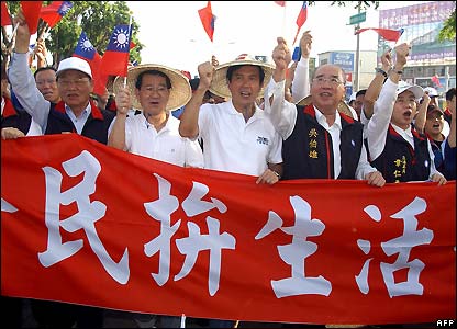 Ứng viên cho cuộc bầu cử Tổng thống vào tháng Ba tới của Quốc Dân đảng, là Ma Ying-jeou (trung tâm), cũng muốn Đài Loan gia nhập Liên Hiệp Quốc, nhưng với tên riêng của mình, là Cộng hoà Trung Hoa.