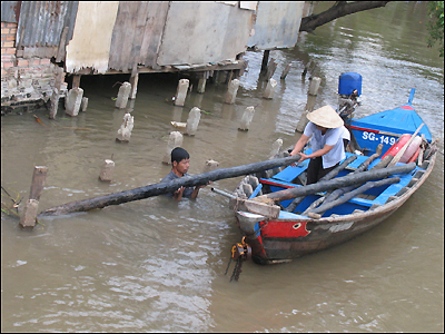 Anh Lê Ngọc Liễu ở ấp Đình phường An Lợi Đông quận 2 hàng ngày cùng mẹ đi trên các tuyến sông giải tỏa để nhổ các cọc về bán. (Ảnh Trần Thanh, TP HCM)