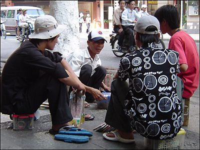 Các em đánh giày ở Sài Gòn đa số từ miền Trung hoặc miền Bắc trôi dạt vào. Đánh một đôi các em được 3 ngàn. (Ảnh Nguyễn Trí Dũng, TP HCM.)