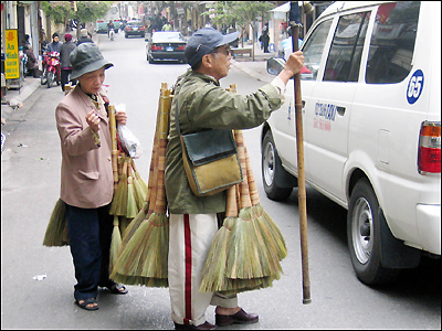 Đôi vợ chồng mù Phạm Đức Sơn ( 69 tuổi) và Trần Thị Chanh (55 tuổi) đi bán chổi khắp phố phường Hà Nội mỗi ngày. (Ảnh Minh Tuấn, Hà Nội)