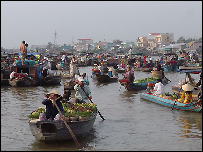Họp chợ nổi Cái Răng – Cần Thơ, tiếng thuyền máy tạch tạch tấp nập, tiếng gọi hàng í ới, và màu của các loại rau quả ở đây thật ấn tượng. (Ảnh Nguyễn Trí Dũng, TP. HCM.)