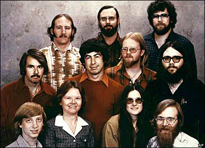 Ông Gates sáng lập ra Microsoft vào năm 1975, với người bạn từ thời thơ ấu là Paul Allen (hàng dưới cùng bên phải), sau khi bỏ trường Đại học.