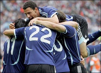 Phút 49, Roberto Ayala đánh đầu mở tỉ số cho Argentina