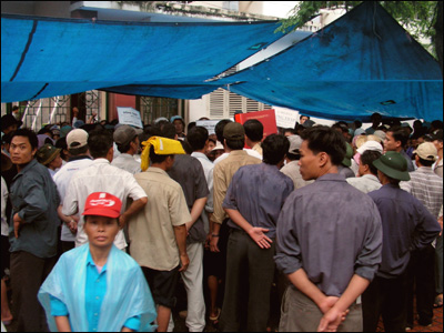 Cảnh những người nông dân mất đất từ các vùng quê đứng trước văn phòng Quốc hội ở Hà Nội đang diễn ra đến ngày thứ hai (30-8). Hôm trước đó, khoảng 300 người dân từ Hưng Yên đã tụ họp đòi chính phủ trung ương can thiệp điều mà họ nói mức đền bù đất quá thấp