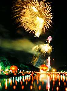 Lung linh pháo hoa phát sáng soi mình lung trong ánh nước.
