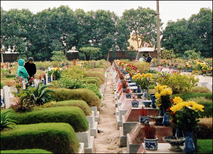 Nghĩa trang đẹp như vườn hoa. Chỉ có những gia đình trung lưu trở lên mới có đất để xây cất mộ.