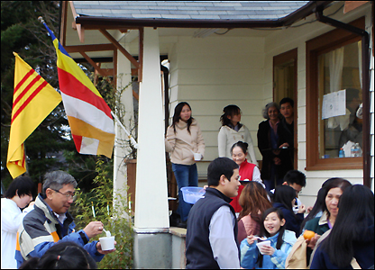 Trời lạnh lắm, nhưng chùa chật quá, rủ nhau Phật Tử ra ngoài sân, ăn lót dạ những món ăn chay thật ấm lòng, ấm tình đồng hương chung vui ngày Tết.