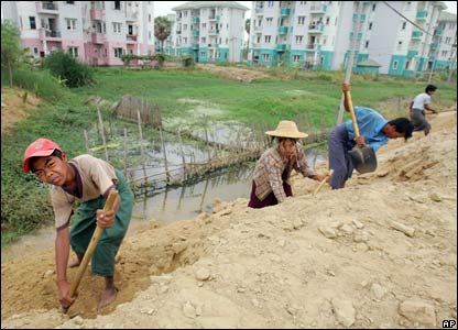 Công việc xây dựng tại Naypyidaw hiện vẫn chưa hoàn tất. Những người thợ trẻ tiếp tục dọn dẹp đất đai quanh các khu nhà mà giới công chức sinh sống.