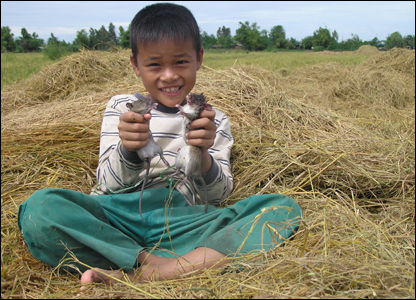 Bé Nguyễn Viết Hưng, 13 tuổi, ở Vĩnh Thạnh, Cần Thơ đã theo cha mẹ đi cắt lúa mướn được 2 năm nay. Hưng tiếp ba mẹ gom lúa vào một đống, xong việc em chạy khắp đồng bắt cá, cua, ốc, chuột…để cải thiện bữa ăn cho gia đình. “Hai con chuột này về má làm, bằm ra, rang muối ớt với xả là được một bữa chiều ngon rồi!”- Hưng nói.