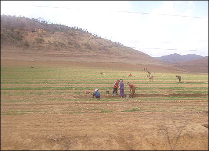 Nông dân trên đồng ruộng trong vụ xuân. Nước này cần phải cố đạt những vụ mùa tốt để đối phó với nạn thiếu lương thực. Ngay cả khi bội thu, Bắc Hàn vẫn cần viện trợ lương thực quốc tế. Hàng ngàn người sẽ được huy động từ thành thị về khi vào mùa.