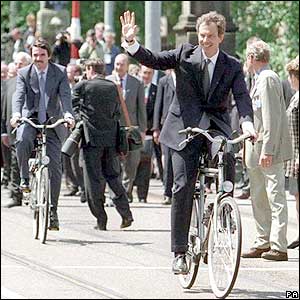 Ông Tony Blair phô ra hình ảnh trẻ trung khi đạp xe tới dự một hội nghị thượng đỉnh của Liên minh châu Âu tại thủ đô Amsterdam của Hà Lan.