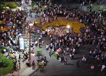 Chúng tôi đã được sống trong cảm giác rộn ràng đón Tết ở quê nhà không nơi nào có được. Trong hình là quang cảnh đường hoa Nguyễn Huệ nhìn từ KS Kim Đô trong giờ giao thừa Xuân Đinh Hợi.