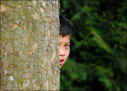 Vài em trẻ Việt Nam đang chơi trò trốn tìm ở ngoài công viên.