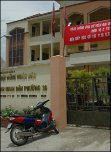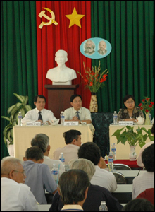 Sáu ứng viên chỉ ngồi nghe các cử tri nêu lên những bức xúc của họ trong trụ sở UBND Phường, nơi hình của các lãnh tụ Marx và Lenin từ hàng trăm năm trước cùng cờ búa liềm được treo cao.