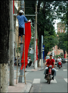 Kế hoạch của đầu ngày hôm nay là treo cờ dọc hai bên đường Đồng Khởi, con đường được coi là đẹp và mắc nhất Sài Gòn, đổi từ tên cũ là đường Tự Do.