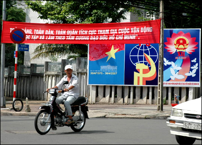 Không thấy ai nói phải chọn ai trong số các ứng viên nhưng cờ Đảng và hình ảnh Hồ Chí Minh luôn đi kèm các băng rôn chào mừng ngày bầu cử.