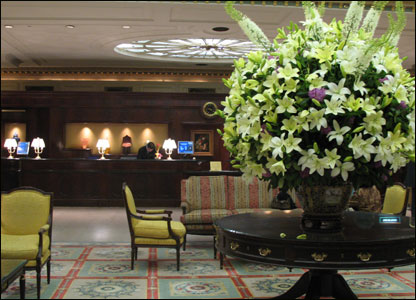 Lẵng hoa của khách sạn chào đón phái đoàn của chủ tịch nước Việt Nam. Phóng viên BBC cũng trọ trong khách sạn này.