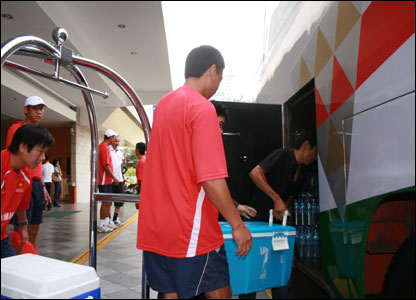 Bangkok có vẻ không nóng bằng Hà Nội nhưng hàng chục chai nước lạnh được đưa vào xe đưa các cầu thủ ra sân.