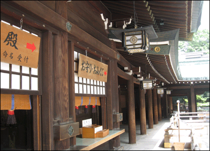 Du khách chỉ được vào gian này trong điện thờ chính tại khu vực đền Minh Trị. Gian nhà phía sau chỉ mở cửa khi chính Thiên Hoàng đến làm lễ. Họa tiết hoa cúc là biểu tượng của Hoàng Gia.