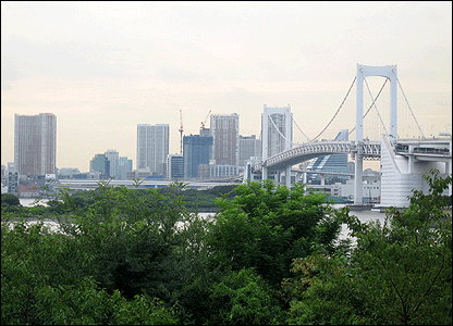 Một nét khác của hiện đại hóa, kết quả của tư tưởng Minh Trị chính là cầu treo Rainbow Bridge vắt qua vịnh Tokyo. Hoàn tất năm 1993 cầu đẹp và có nhiều giải pháp kỹ thuật độc đáo như lối lên của xe lửa chạy vòng để không chiếm nhiều đất.