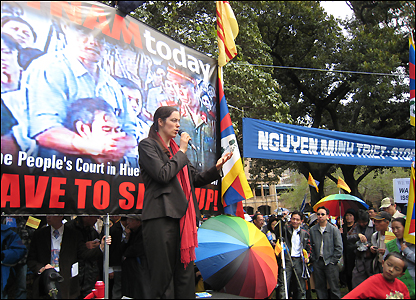 TNS Kerry Nettle, Ðảng Xanh, Quốc hội Liên bang Úc: ''Chính sách của chúng tôi đặt trên căn bản con người. Ðảng Xanh đã và sẽ tiếp tục đặt vấn đề giao thương có điều kiện với các chế độ đang xâm phạm nhân quyền và đàn áp dân chủ.''