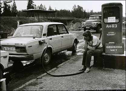 Những cải cách do ông Gorbachev đưa ra dưới chính sách ''cải tổ'' đã tạo ra nhiều khó khăn kinh tế. Phóng viên chụp được cảnh một lái xe chán chường ngồi cạnh biển 'hết xăng'.