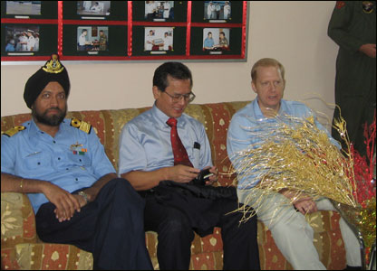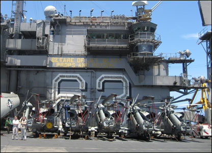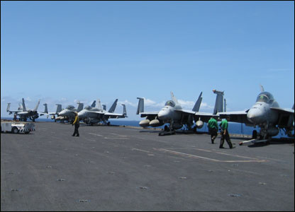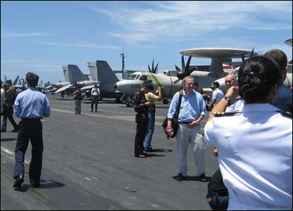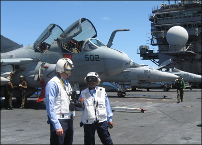 Phóng viên BBC Mahmud Ali (bên phải) trao đổi với một quân nhân. Đằng sau chính là chiếc A7, phi cơ săn tàu ngầm, và xa bên phải là một chiếc F18.