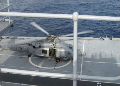 Nhìn từ một vị trí bên boong có thể thấy chiếc trực thăng Sikorski đang trực chiến.