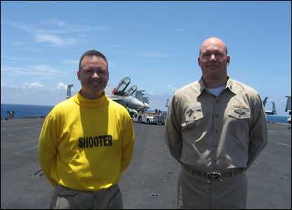 Hai quân nhân Mỹ. Người bên trái là một shooter, chuyên lo việc phóng phi cơ khỏi hàng không mẫu hạng, bên phải là một sĩ quan điều khiến chiến sự từ trung tâm CDC tức Combat Direction Center
