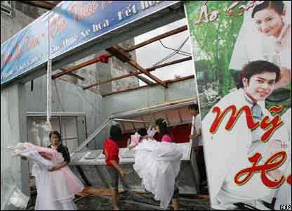 Trên ảnh là nhân viên một cửa hàng áo cưới ở Hà Tĩnh đang dọn dẹp sau bão. Các doanh nghiệp cũng bị thiệt hại.
