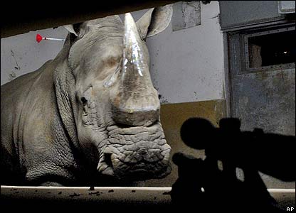 Lulu, cô tê giác trắng quý hiếm tại vườn thú Budapest đang được chích thuốc mê để các chuyên gia thú y kiểm tra bào thai trong bụng.