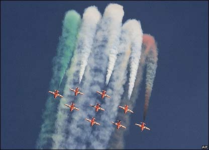 Các chiến đấu cơ để lại làn khói màu mô phỏng lá quốc kỳ Ấn Độ trong buổi biểu diễn nhân ngày Không quân lần thứ 75 được tổ chức kỷ niệm ngoài ngoại ô Delhi.
