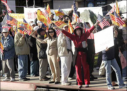 Chừng 200 người gốc Việt vẫy cờ Mỹ và cờ Việt Nam Cộng Hòa đứng dọc đường phố khu Asian Gardens Mall. Họ mang theo nhiều biểu ngữ bày tỏ sự tức giận trước việc Trung Quốc chiếm các hòn đảo ngoài biển Đông.
