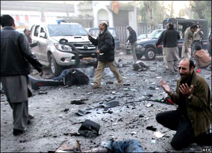 Được tin kẻ tấn công đã bắn vào cổ bà Bhutto trước khi tự cho nổ tung. Quang cảnh vô cùng hỗn độn sau khi bom nổ.