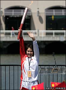 Người rước đuốc đầu tiên, Lin Lee, nhận ngọn đuốc cháy sáng trước sự theo dõi của truyền thông toàn thế giới, mở màn cho lễ rước đuốc.