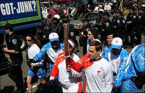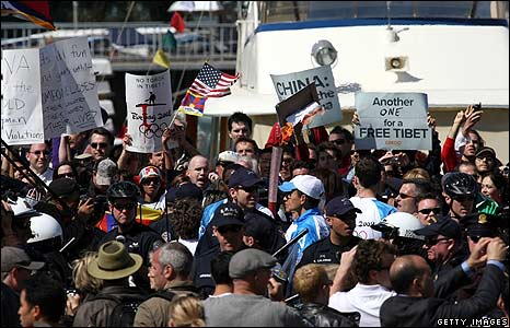 Giống như người biểu tình ở London và Paris, những người phản đối tại San Francisco hôm thứ Tư đã tập trung dọc theo lộ trình rước đuốc Olympic để phản đối lối hành xử của Bắc Kinh tại Tây Tạng.