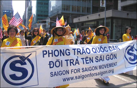 Trong cuộc diễn hành văn hóa di dân cũng có xen những thông điệp chính trị. Đoàn diễn hành của phong trào đòi trả lại tên cho thành phố Sài Gòn mang theo biểu ngữ lớn.
